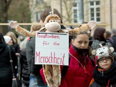 马普所外的一位抗议者举着一个被钉在十字架上的玩具猴子。图片来源:Michael Lat...