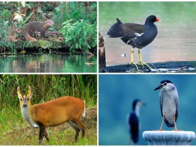 执法人员查获食蟹獴(左上)、黑水鸡(右上)、赤麂(左下)及夜鹭(右下)等保护...