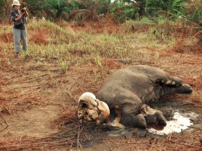 苏门答腊象伏尸地上,象牙惨被拔去。 现时全球野外只剩下不足3千只苏门答腊象...
