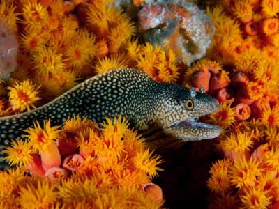 一尾鳗鱼游过加蓬一座钻油平台附近的珊瑚块礁 (神秘的地球报道)据美国国家地理...