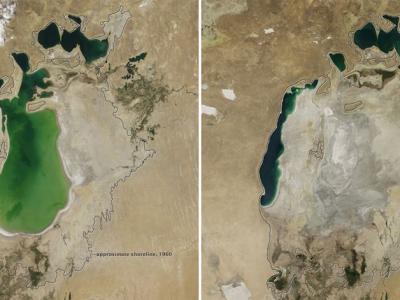 2000年的咸海面积(左)相较于1960年(黑线标示范围)已经缩减很多。 ...