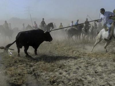 德拉维加节用矛刺死公牛活动 (神秘的地球报道)数以千计西班牙民众周六在马德里...