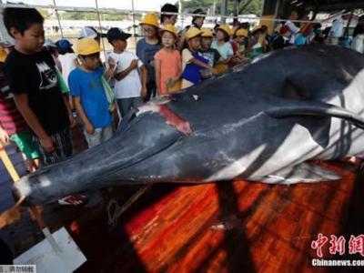 为了纪念捕鲸季开始,千叶市屠鲸厂组织日本在校学生围观宰杀鲸鱼的过程,并将割下...