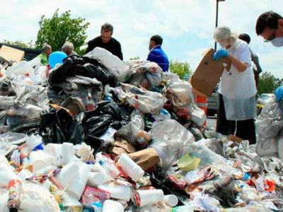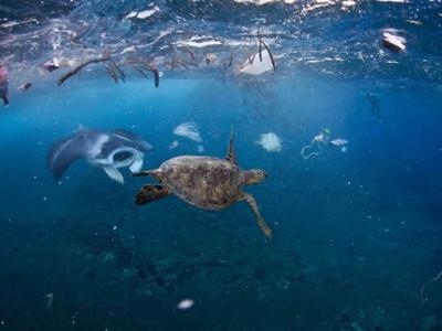 日本蝠鲼(manta ray)和绿蠵龟漂游在塑胶袋、牛奶瓶,和其他从欧...