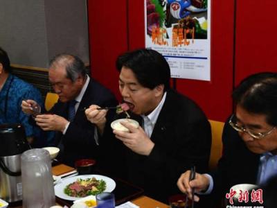 资料图:当地时间2014年6月9日,日本农业大臣林芳正在农业部餐厅享用鲸鱼肉...