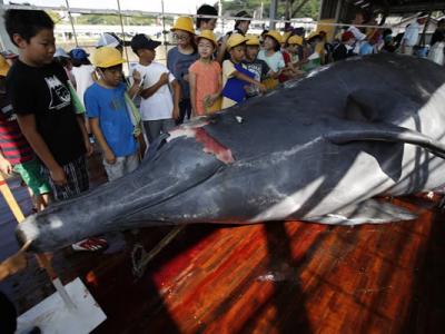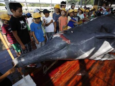 日本捕鲸团体邀请小学生参观鲸鱼解剖过程
