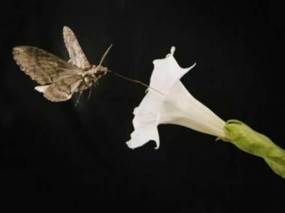 图为一只飞蛾正在对花卉授粉,最新研究表明,车辆尾气带来的污染不容忽视,将破坏...
