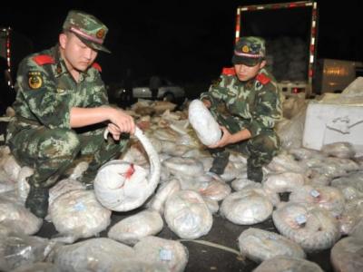 边防人员核实缴获的急冻穿山甲数量 边防人员展示走私的急冻穿山甲 边防人员...