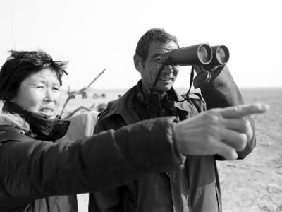 李合法夫妇在观察国家一级保护动物大鸨 大鸨的警戒距离五六十米左右,很难走近...
