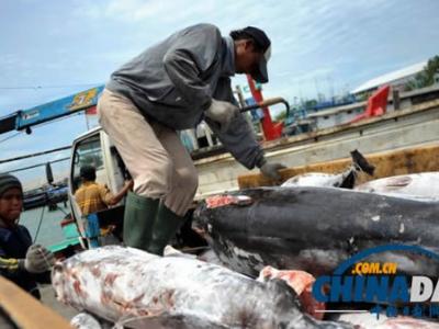 印尼巴厘岛渔民从船上卸下鲨鱼 据中国日报网:法国媒体7月29日报道,为更好地实...