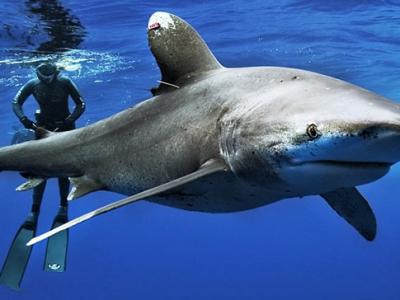 自然资源保护者与白鳍鲨在海中共舞