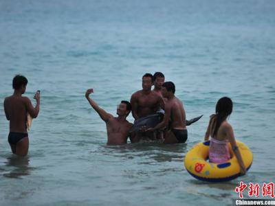 海南三亚海豚搁浅受伤 市民游客竟争相合影 海南三亚海豚搁浅受伤 市民游客竟...