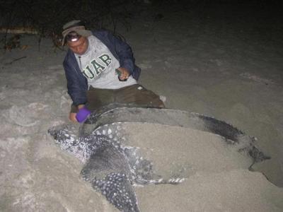研究人员在给一只产蛋的母棱龟添加标签 科学家称,巨大的太平洋棱龟因数量骤减可...