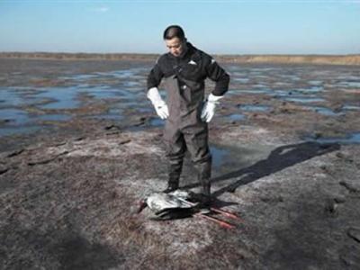 一名志愿者站在湿地里,默默注视着被打捞上来的东方白鹳尸体。 一名志愿者在湿...
