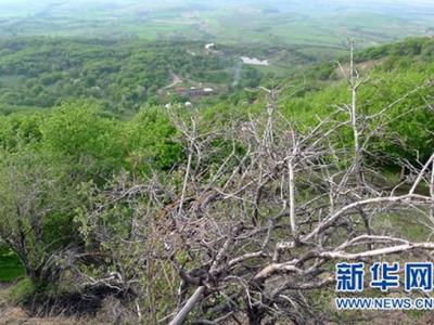 天山野苹果林内的小吉丁虫虫害向周边蔓延(5月1日摄)。 受小吉丁虫影响,今年...