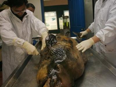 4月17日,中国科学院武汉水生所的专家在解剖死亡的江豚 死亡江豚的尾鳍已经乌...