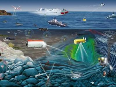 科学家们在极地冰上及冰下探索。水上飞机通过散射光遥测海洋动物的出没。海洋动物...