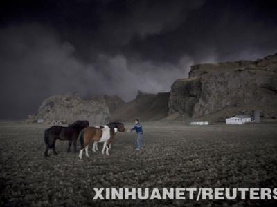 4月17日,在冰岛一处农场,农夫索拉林·奥拉夫松试图安抚他的马匹免受夹杂火山灰...
