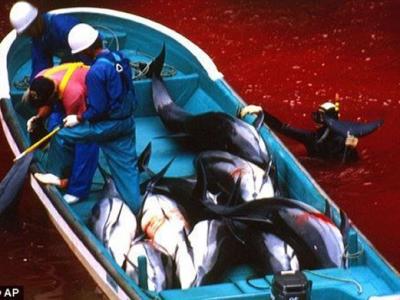 日本太地町渔民大肆捕杀海豚 在太地町海湾,日本渔民宰杀海豚,周围海水已被染成...