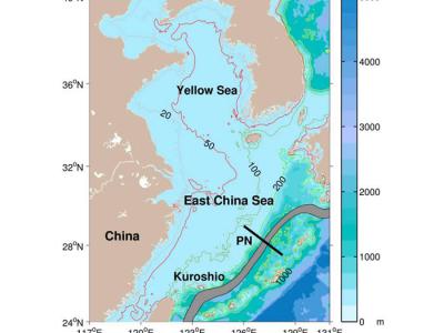 黄海与东中国海的地形图,以及黑潮路径和PN断面的位...