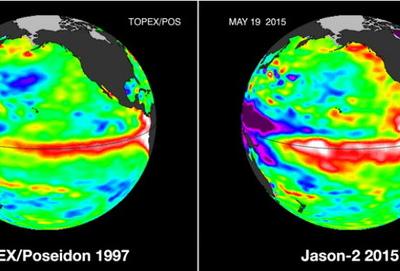 左为1997年时高于平常的海平面温度(红色区块)图。右为今年的海平面温度图。 (神...