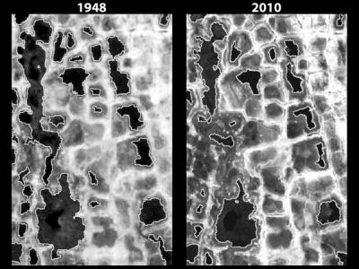 1948年航拍的横跨阿拉斯加的巴罗半岛的高分辨率的照片(左)同于2002年、2008年和...