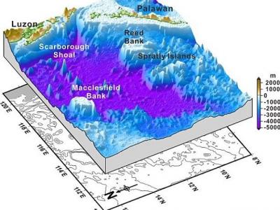 这张图片展示了包括中国南海里德沙洲和巴拉望岛在内的海底山脉 (神秘的地球报道...