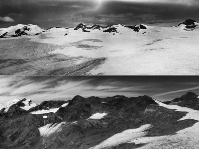 随全球气温不断上升,不少山岳冰川正陆续减少。上图为1933年意大利一处冰川,下图...