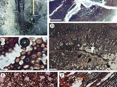 “斯氏具隔髓松木”野外照片及横切面(神秘的地球报道)据扬子晚报(朱姝):提到吐...