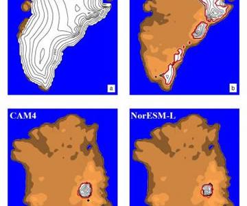 模拟的现代(a)和上新世中期(b~d)格陵兰冰盖表面高度,其中上新世中期气候强迫来自...