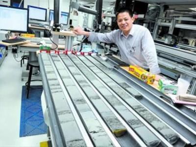同济大学海洋与地球科学学院教授刘志飞与浊流沉积岩芯合影。(资料照片) (神秘...