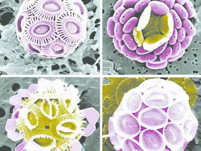 四种颗石藻球(钙质超微浮游植物的一类)的扫描电镜照片 (神秘的地球)据中国科...