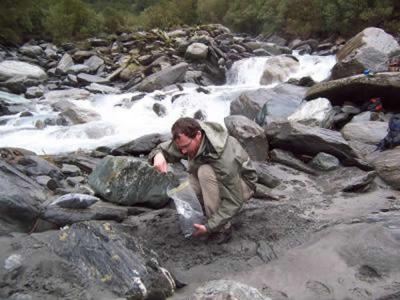 在Rapid Creek收集砂样进行铍分析 (神秘的地球)据EurekAlert!:在新西兰山区工...