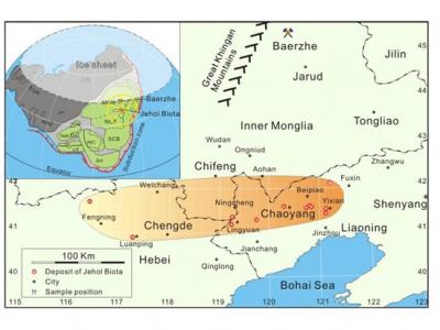 巴尔哲岩体和热河动物群化石点的地理位置及其早白垩世的古地理位置 岩浆和热液...