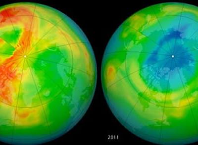 2010年北极上空的臭氧浓度(左)和2011年臭氧浓度的对比图 科学家最新得出造成2...