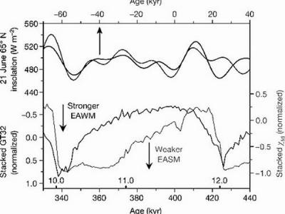 40万年前后黄土粒度和磁化率显示北极冰盖滞后全球冰期发展至少2万年,指示北半球...