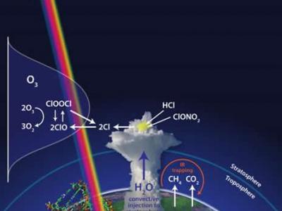 这是连接水汽对流注入夏天美国上方的较下层的平流层的光化学反应和臭氧催化去除的...