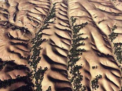 土壤蠕动和河流切割共同形成了一种常见的地形特征,图为美国加利福尼亚州Gabilan...