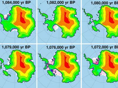来自岩芯的数据展现了西南极冰盖(粉色)在数千年来的进与退。 如果海洋温度上升...
