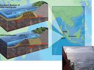 利用声爆(小图),研究人员分析了两次苏门达腊地震震源区的海底岩层特性。(图片...