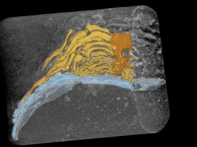 对一个3200万年前的海带化石进行的X射线重建显示了其底部(橙色)、固着物(黄色)...