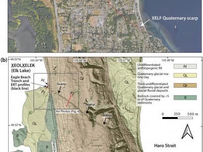 (Saanich半岛郊区的GoogleTM卫星图像,以XELF上的第四纪断崖痕迹作为参照。(b)与(a...