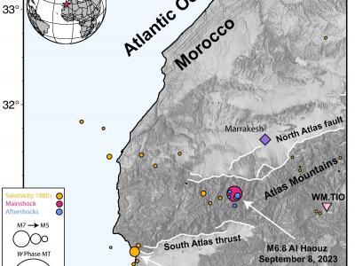详细描述高阿特拉斯山脉周围地震活动的地图,包括2023年Al Houz地震(橙色圆圈)、20...