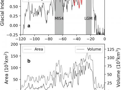 基于EPICA(实线)和Bergsee(虚线)气候作用力信号(实线,a图)的冰川指数的时间演变,...