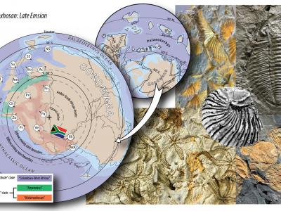 插图是在南非发现的常见无脊椎动物化石。从左顺时针方向:Australospirifer和Austra...