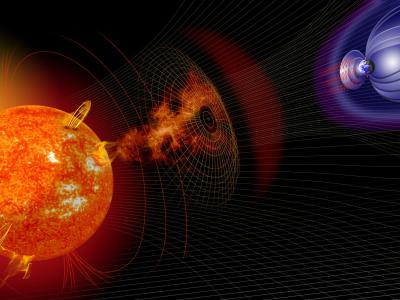 艺术家插图的事件对太阳改变了近地空间的条件。鸣谢:uux.cn/美国宇航局(神秘的地球...