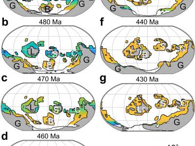 模拟奥陶纪生物多样性的空间格局。a-g地块为灰色阴影。大陆架用黑色标出。每隔30度...