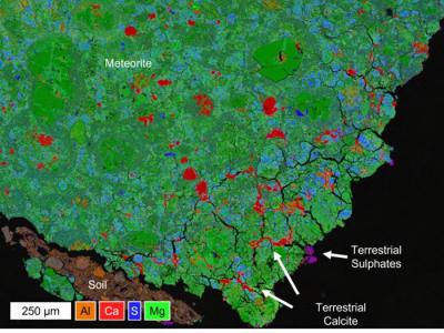 绵羊农场陨石的样本,箭头所指的地方显示出受到地球大气作用所产生的矿物质。 (Uni...