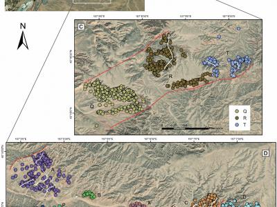图1. 三盛公地区位置及其22个剖面上的化石点分布图。图2. 三盛公地区岩性柱状图及各...