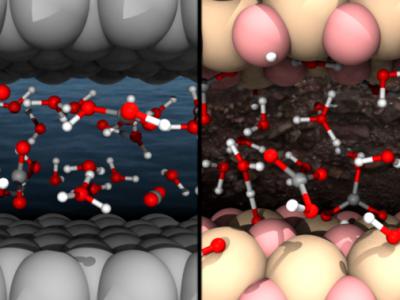 左图:溶液被石墨烯限制。右图:溶液被斯石英(SiO2)限制。白色、灰色、红色和粉红...